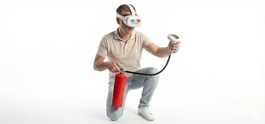 Scénář B (Real-time Interaktivní VR): Nasadíte si brýle a stojíte v digitální kanceláři. Začne hořet. Musíte sami dojít k přístroji (fyzický pohyb). Musíte sami natáhnout ruku, uchopit pojistku a vytrhnout ji. Musíte sami zmáčknout rukojeť a namířit proud na oheň. Pokud to uděláte špatně, oheň nezhasne. Výsledek: Zapojili jste svalovou paměť (motorické učení). Váš mozek si zážitek uložil jako „prožitou zkušenost“, nikoliv jen jako „shlédnutý film“.